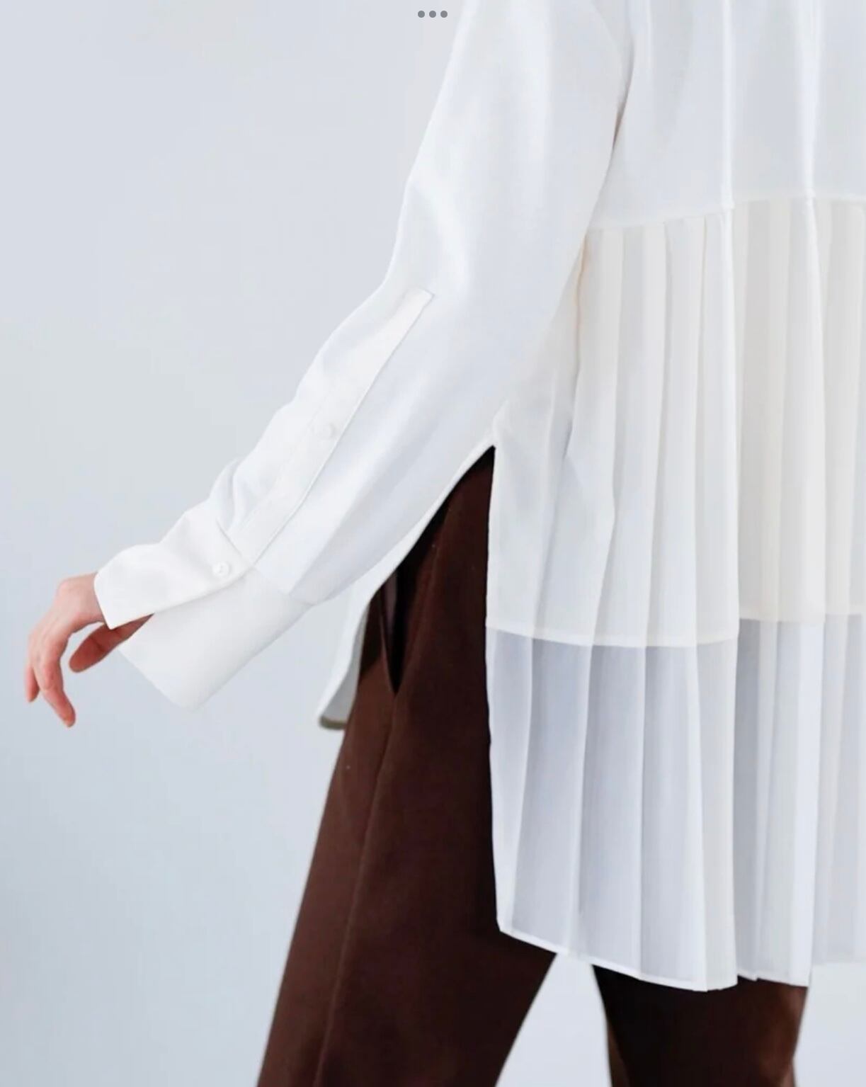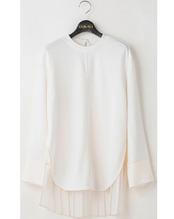 バックシルエットにアイコニックな異素材プリーツをドッキングしたカットソーチュニック。カジュアルなアイテムの中に女らしいデザインをプラスすることでシンプルな中にも大人で印象深い一枚に。カフ部分はシャツ生地で仕立てることでレイヤードのインナーとしてもアレンジがきく仕様に。衿ぐりはバックスリット開きで大きく開かず、カジュアルになり過ぎない配慮です。