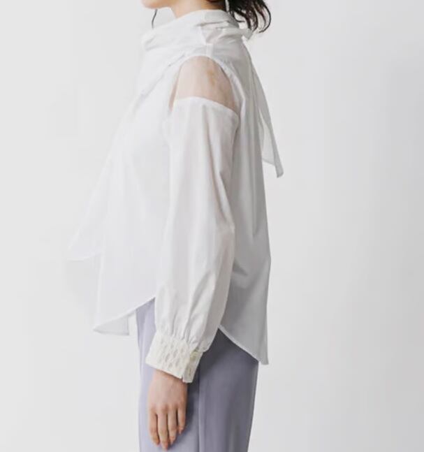 し、ドライタッチで程よいハリとシャリ感が肌への結び方次第でアレンジできるリボンタイブラウス。光沢感と透明感ある発色の綿混のタイプライター生地を使用し、